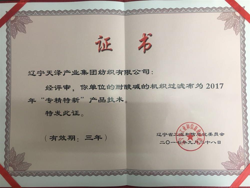 耐酸堿的機(jī)制過(guò)濾布”和“混紡導(dǎo)電紗及其防靜電過(guò)濾布”獲遼寧省2017年中小企業(yè)“專精新特”產(chǎn)品技術(shù)