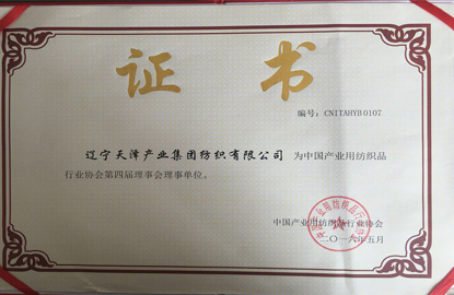中國產(chǎn)業(yè)用紡織品行業(yè)協(xié)會理事單位證書